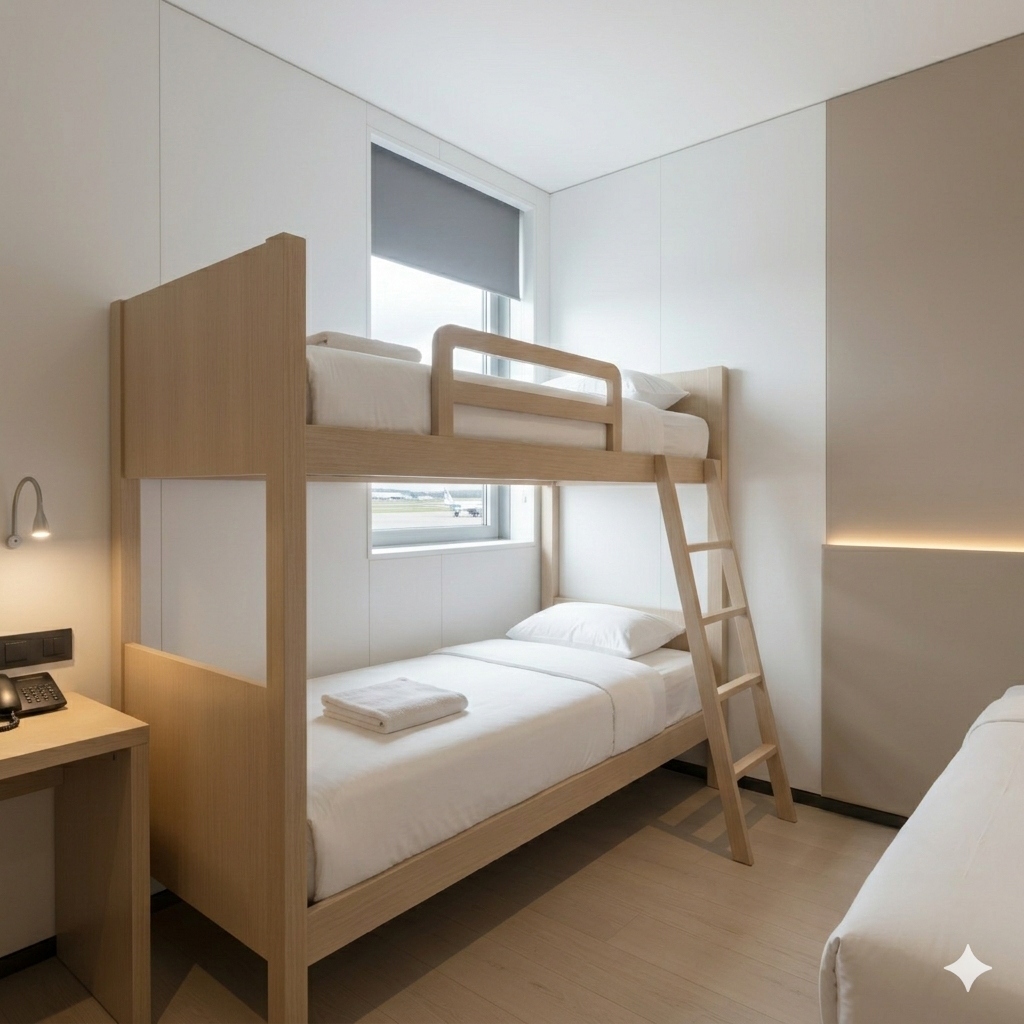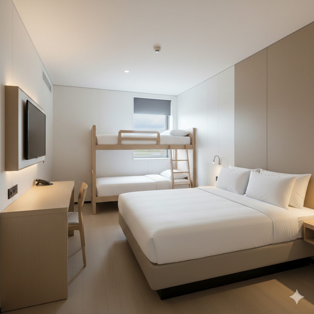 La solución perfecta para familias o pequeños grupos. Una habitación amplia con cama Queen y posibilidad de litera o supletoria. Espacio para maletas, baño completo y zona de estar. Ideal para esperas largas con total comodidad.